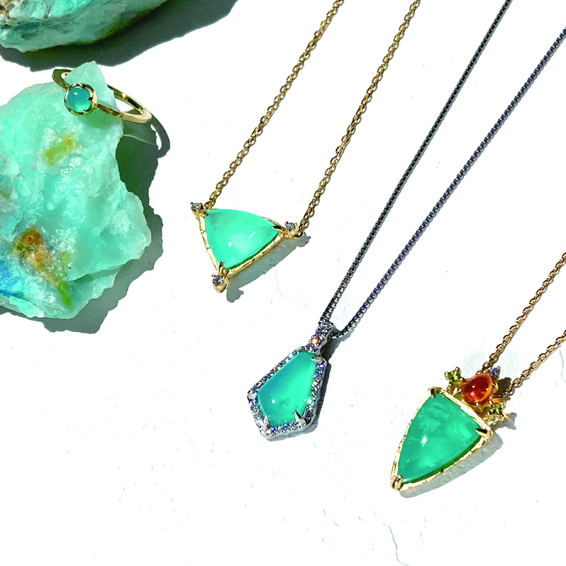 同時に、世界最大の鉱物見本市であるアメリカのツーソンショーで出会った原石を用い、小さなアトリエで一つひとつ丁寧にジュエリーを制作しています。